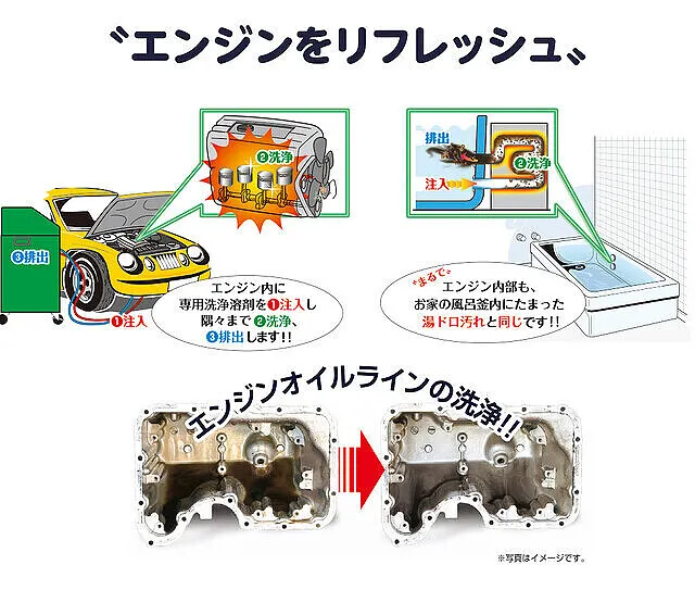 エンジンの中にはスラッジと呼ばれる汚れが溜まっていきます。通常オイル交換をすることによりその汚れはある程度取り除かれますが、オイルの通り道は非常に狭い通路もあり、其処に溜まったスラッジは中々取り除けません。それを放置すると、エンジンの潤滑が滞り、エンジンに不具合をもたらします。そこで、専用の機械によりエンジン洗浄液をエアーの圧力により、細い通路にも送り込みエンジン内のスラッジを一掃いたします。フラッシングオイル等では取り除けない洗浄力を、是非体感してみてください。