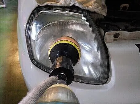 経年劣化によりくすんでしまったヘッドライトを、専用のコンパウンドを使いポリッシャーで研磨して、